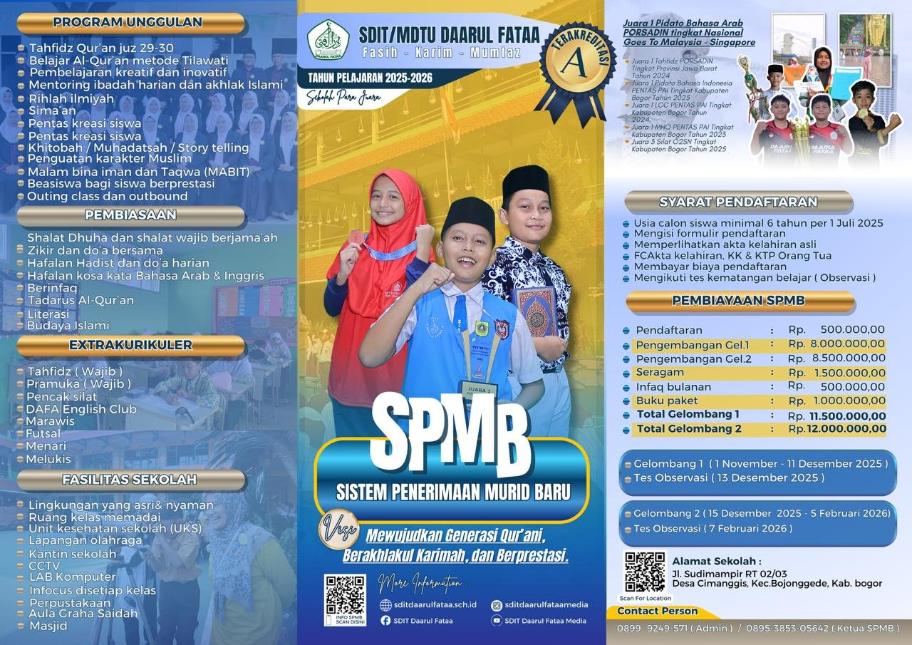 SDIT DAARUL FATAA menjadi salah satu model pendidikan Islam unggulan yang integral, memadukan konsep pendidikan berbasis kurikulum Pendidikan Nasional dengan konsep pembinaan karakter melalui penanaman nilai-nilai ke-Islaman dan tradisi luhur secara praktis dan teoritis.